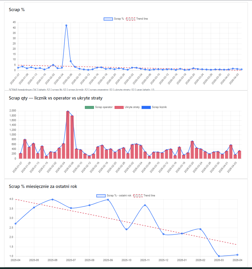 Widok łączy scrap %, ilość odpadu, dane licznikowe i ukryte straty. Pozwala szybko zauważyć skoki, trendy i różnice między raportowaniem operatora a rzeczywistym wynikiem procesu.